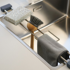 Skilleveggen er også smart å bruke som tørkestativ til de ulike rettene dine. Oppvaskklut, oppvaskbørste og oppvasksvamp har en naturlig plass på kjøkkenet og vil tørke betydelig raskere enn om de står på vasken eller nede i vasken.